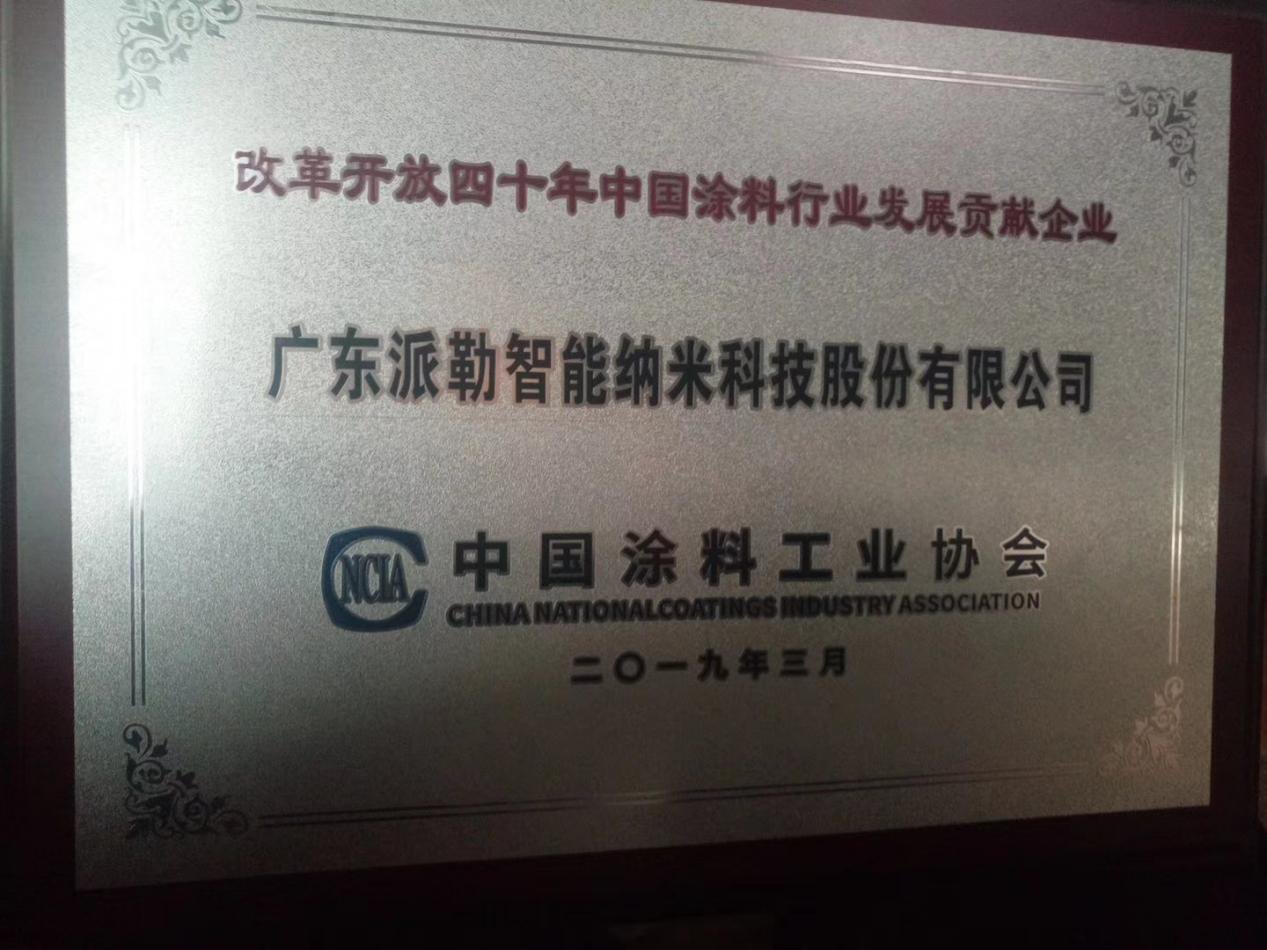 2019年3月在河南濮阳隆重召开的以“创新驱动,绿色发展”为主题的“2019年中国涂料大会”上,派勒荣获“改革开放四十年中国涂料行业发展贡献企业”,派勒总经理雷立猛先生荣获“改革开放四十年中国涂料卓越贡献者”荣誉称号。