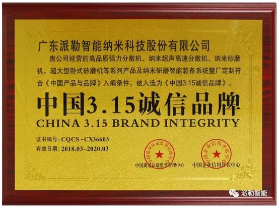 2018年派勒的高品质强力分散机、纳米超声高速分散机、纳米砂磨机、超大型卧式砂磨机等系列产品及纳米研磨智能装备系统整厂定制符合《中国产品与品牌》入编条件,被中国质量认证监督管理中心、中国企业信用评估中心授予“中国3.15诚信品牌”荣誉称号!不负大众所望,派勒将诚信融入到企业文化之中,为分散与纳米研磨行业的发展持续作出应有的贡献。